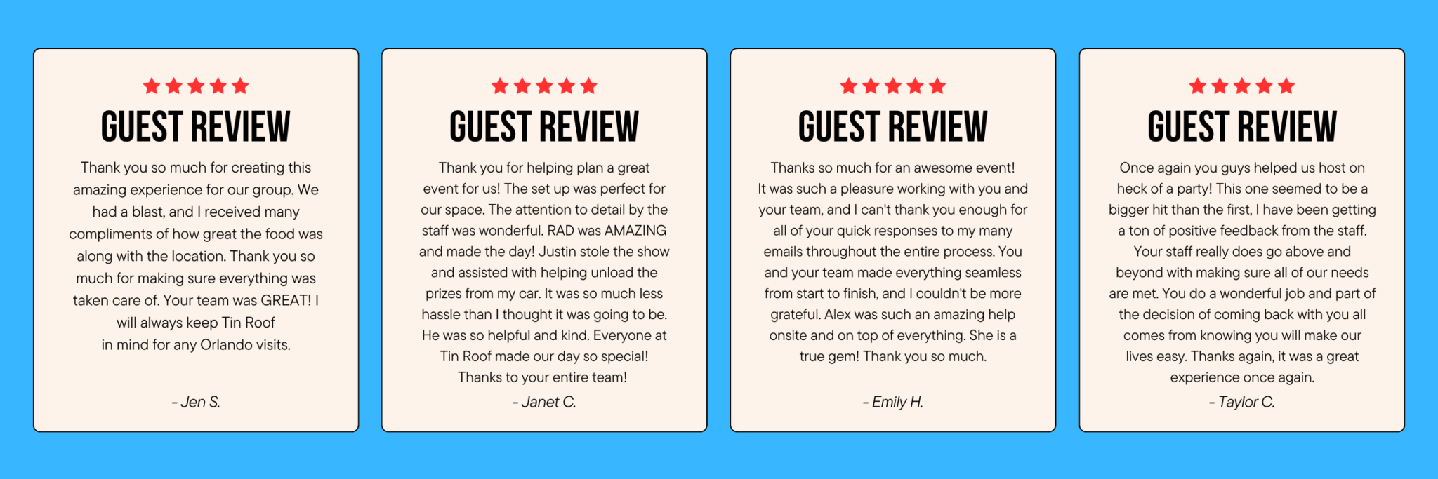 Bring your group to Tin Roof! We are Located at ICON Park, convenient to the Convention Center and so much more. Our space is 11,800 square feet with two great spaces to hold up to 800 guests. Tin Roof has a scratch kitchen, no microwaves in house, with a fun, eclectic menu. Let us customize the perfect food, beverage, and entertainment package to make your event fun & amazing. With LCD digital monitors throughout, 2-10’ projection screens, 2 full professional stages, sound & lighting packages, branding is made simple ensuring each event is unique for you and your guests. Have more guests? Ask about our Block Party capabilities on the Lawn!